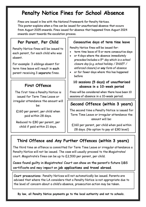 Penalty Notices for school absenceRegular attendance is vital to ensure that children make the most of their learning opportunities. We want to remind families of their legal responsibility around attendance and the circumstances where a penalty notices may be issued. It is very important that you read this information carefully as there are some changes. Please come to the office if you have any questions.